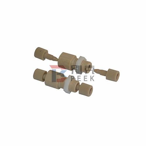 PEEK穿墙两通,1/16PEEK穿墙二通,PEEK穿板接头,连接1/16和1/8的PEEK接头,和PEEK管,也可实现2种不同外径管子的转接。PEEK穿墙二通,又叫PEEK过墙式二通,有1/4-28对1/4-28的,有1/4-28对10-32的,有10-32对10-32。适用于1/16的管和接头及1/8的管和接头;PEEK耐高压,耐腐蚀,高精度,是分析仪器行业通用的材料。